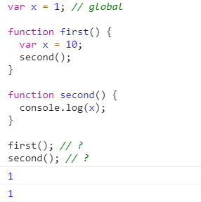 그렇기 때문에, second() 함수가 first() 함수 안에서 호출된 것과 상관없이 second() 함수는 global 범위에 선언되어 있으므로, global 범위에 있는 변수 x의 값 1이 두 번 출력된 것이다.